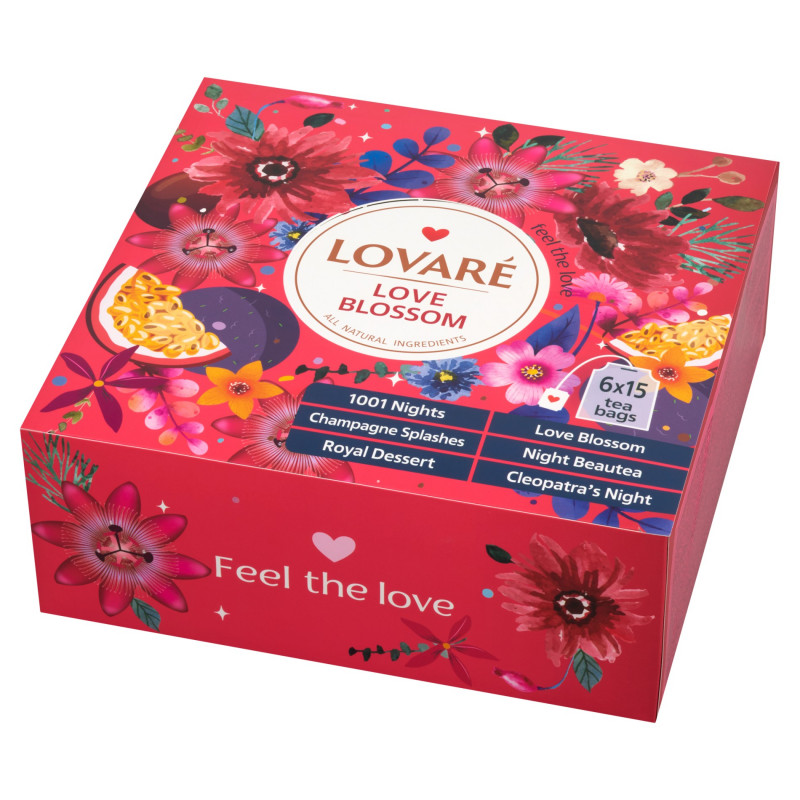 Skład zestawu: Herbata Lovare w asortymencie. 90 torebek herbaty w indywidualnych kopertach - 6 rodzajów po 15 sztuk. Masa netto herbaty w zestawie: 165 g.