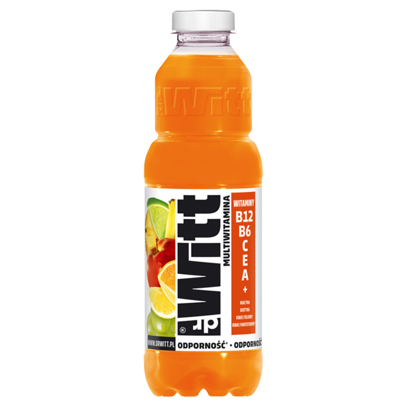 Napój wieloowocowy z dodatkiem witamin: A, E, C, niacyny, B6, kwasu foliowego, B12, biotyny i kwasu pantotenowego. Pasteryzowany. Zawiera cukier i substancję słodzącą.