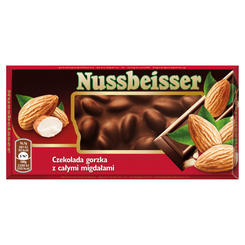 Czekolada gorzka z całymi migdałami - głęboki smak i chrupiąca struktura dla wielbicieli klasycznej, ciemnej czekolady. Każdy kawałek czekolady Nussbeisser wypełniają po brzegi całe orzechy. Nie czekaj, przełam tabliczkę po swojemu i daj się porwać chrupiącym doznaniom. Nussbeisser - czekolada z okienkiem. Okienko na porywający smak. Otwórz sie na wyjatkowe orzechowo-czekoladowe połączenie. Chwile z czekoladą Nussbeisser to pełnia smaku w każdym kawałku.