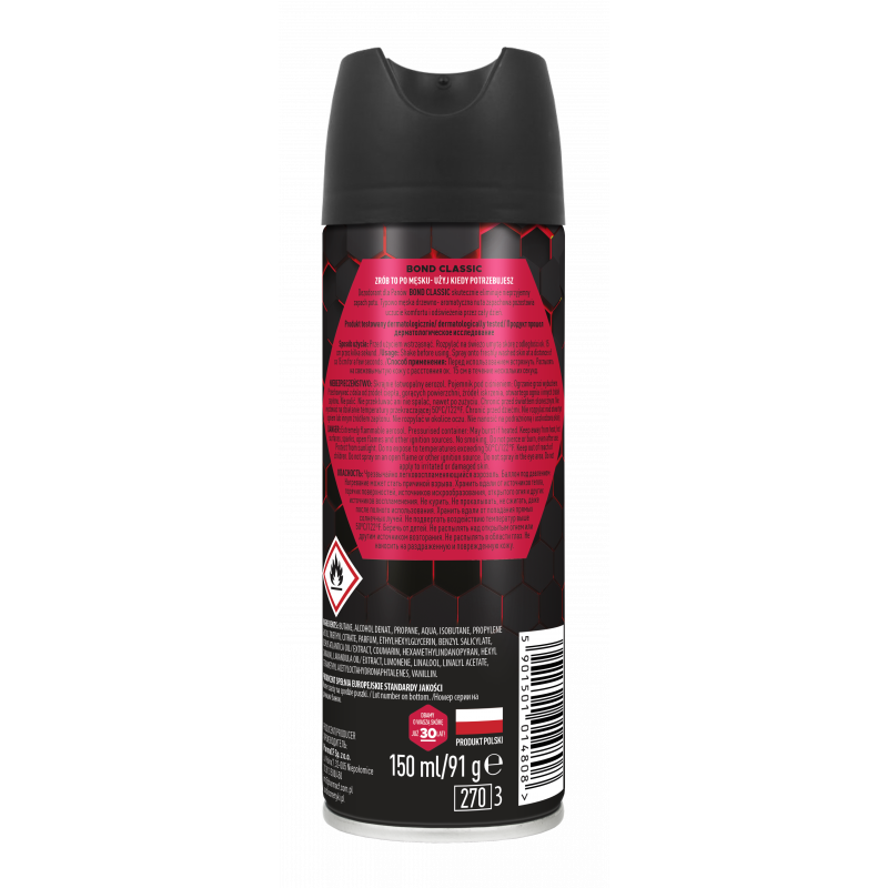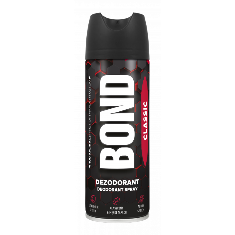 Dezodorant do ciała dla mężczyzn Bond Classic skutecznie eliminuje nieprzyjemny zapach potu. Klasyczna, męska drzewno – aromatyczna nuta zapachowa.