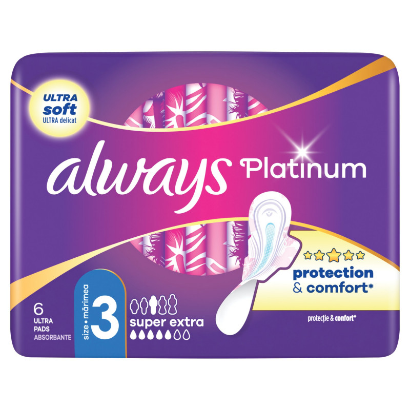 Zapewnij sobie wyjątkową ochronę dzięki podpaskom ALWAYS Platinum Super Extra (R3). Dzięki specjalnej technologii ContourFlex podpaska dokładnie przylega do ciała, nie pozostawiając luk, dzięki czemu chroni przed przeciekaniem. Co więcej, delikatna powłoczka natychmiast wchłania wilgoć, zapewniając suchość i czystość przez cały dzień, a technologia OdourLock neutralizuje przykre zapachy, dzięki czemu możesz cieszyć się świeżością przez cały dzień. Wybierz Always Platinum, aby zapewnić sobie niezawodną ochronę przed przeciekaniem, zwijaniem i przykrym zapachem. W celu dodatkowej ochrony w nocy wypróbuj podpaski Always Night w różnych rozmiarach.