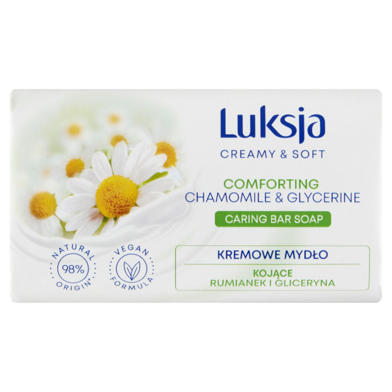 Kremowe mydło w kostce. Zawiera rumianek i glicerynę o kojących właściwościach.