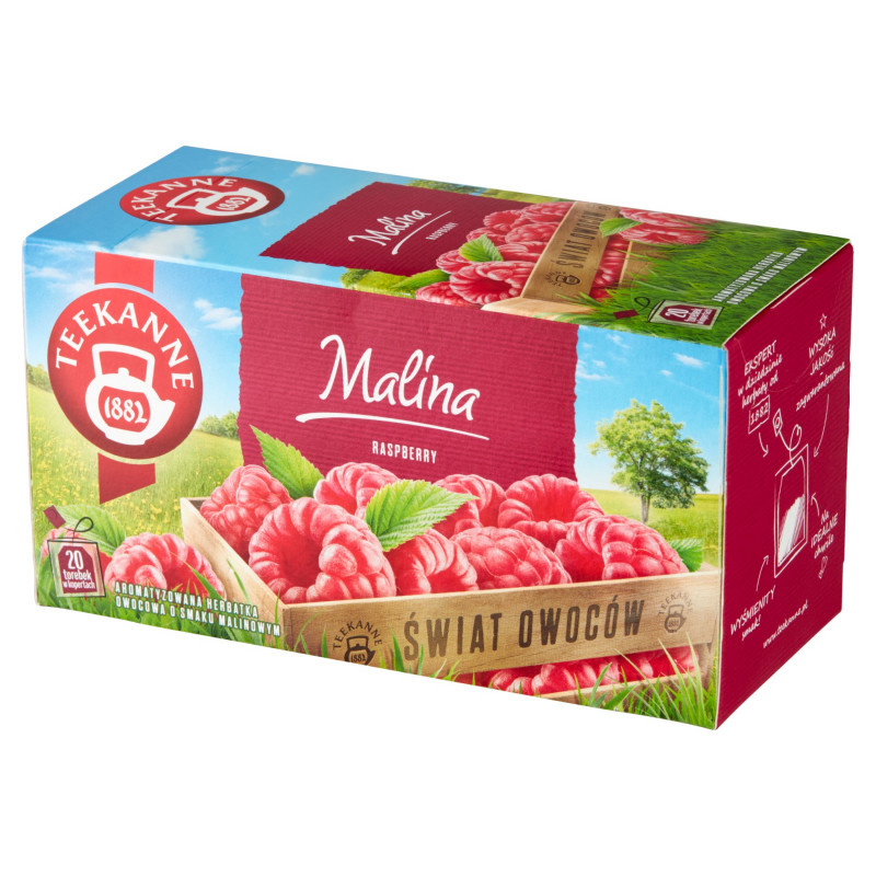 Malina - wyśmienita mieszanka herbatek owocowych o smaku słodkich malin. Ten owocowy napar oferuje znakomite połączenie naturalnych owoców i aromatu dojrzałych w słońcu malin - idealny napój dla całej rodziny. Ciesz się zmysłowym smakiem Teekanne Świat Owoców „Malina” filiżanka za filiżanką. Wyborna na gorąco i na zimno!