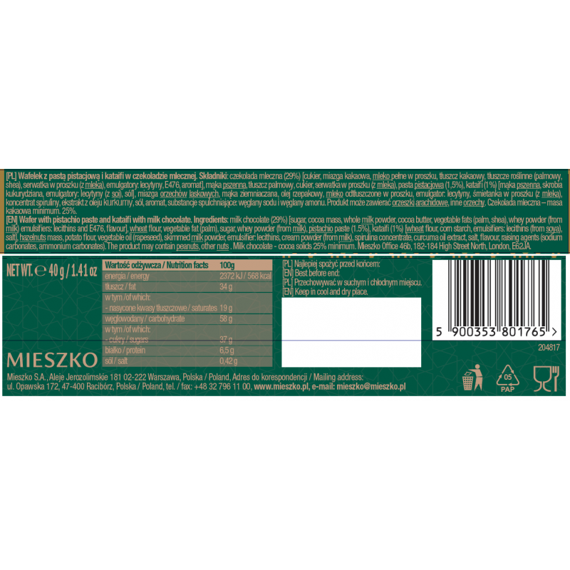 Składniki: Składniki: czekolada mleczna (29%) [cukier, miazga kakaowa, mleko pełne w proszku, tłuszcz kakaowy, tłuszcze roślinne (palmowy, shea), serwatka w proszku (z mleka), emulgatory: lecytyny, E476, aromat], mąka pszenna, tłuszcz palmowy, cukier, serwatka w proszku (z mleka), pasta pistacjowa (1,5%), kataifi (1%) [mąka pszenna, skrobia kukurydziana, emulgatory: lecytyny (z soi), sól], miazga orzechów laskowych, mąka ziemniaczana, olej rzepakowy, mleko odtłuszczone w proszku, emulgator: lecytyny, śmietanka w proszku (z mleka), koncentrat spiruliny, ekstrakt z oleju kurkumy, sól, aromat, substancje spulchniające: węglany sodu i węglany amonu. Produkt może zawierać orzeszki arachidowe, inne orzechy. Czekolada mleczna – masa kakaowa minimum. 25%.
