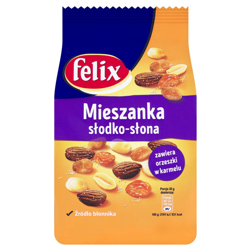 Mieszanka orzeszków ziemnych smażonych solonych (25 %), orzeszków ziemnych w karmelu (25 %), rodzynek (25 %) oraz migdałów dwukrotnie prażonych solonych (25 %).