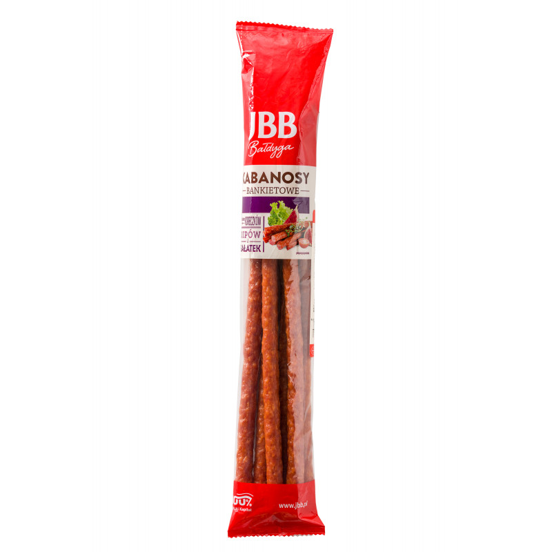 Kiełbasa wieprzowo- drobiowa średnio rozdrobniona wędzona parzona, suszona. Produkt stałowagowy, waga netto opakowania zbiorczego 5,76 kg.
