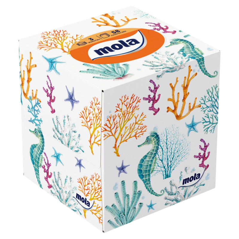 Chusteczki Mola Cubic to miękkie, 3-warstwowe chusteczki kosmetyczne wytworzone z czystej celulozy. Ich stylowe i nowoczesne opakowania będą się pięknie prezentować w Twoim domu. Do wyboru jest aż 6 unikalnych wzorów pełnych pozytywnej energii: artystyczne plamy, koralowce, plaża, zielone liście, kształty geometryczne i domki.
