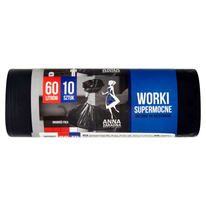 Supermocnych worków na śmieci marki Anna Zaradna użyj do pakowania odpadów sanitarnych i śmieci. Worki są wykonane z grubej folii LDPE, dzięki czemu są bardziej wytrzymałe na obciążenia.