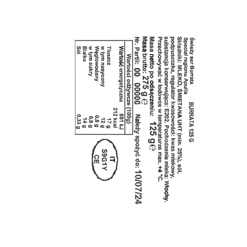 Składniki: mleko pasteryzowane -74.56%, śmietanka UHT - 25%, sól - 0,33%, podpuszczka - 0,01%, regulator kwasowości - 0,1%